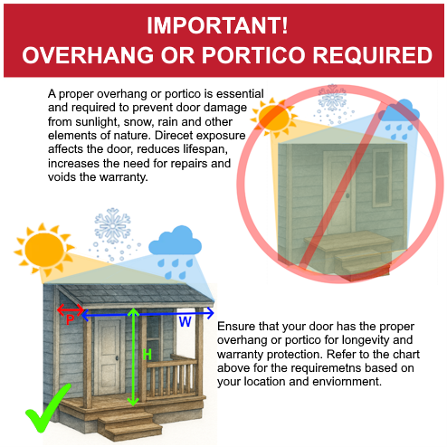 Exterior doors must be appropriately protected from excessive exposure to the elements, temperature and moisture with a sufficient overhang or portico. Exterior products that are not covered by a sufficient overhang or portico are not covered under this limited warranty. For purposes of this limited warranty, “sufficient overhang” depends on the climate and direction the door faces and is calculated as follows